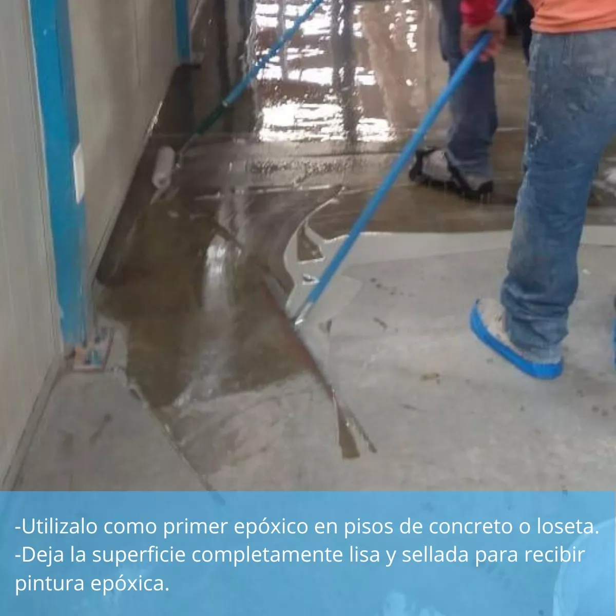 Se utiliza como primer Epóxico para sellar y alisar la superficie como pisos de concreto o pisos cerámicos. Deja una superficie completamente lisa sin juntas lista para recibir el acabado con porcelanato líquido.
