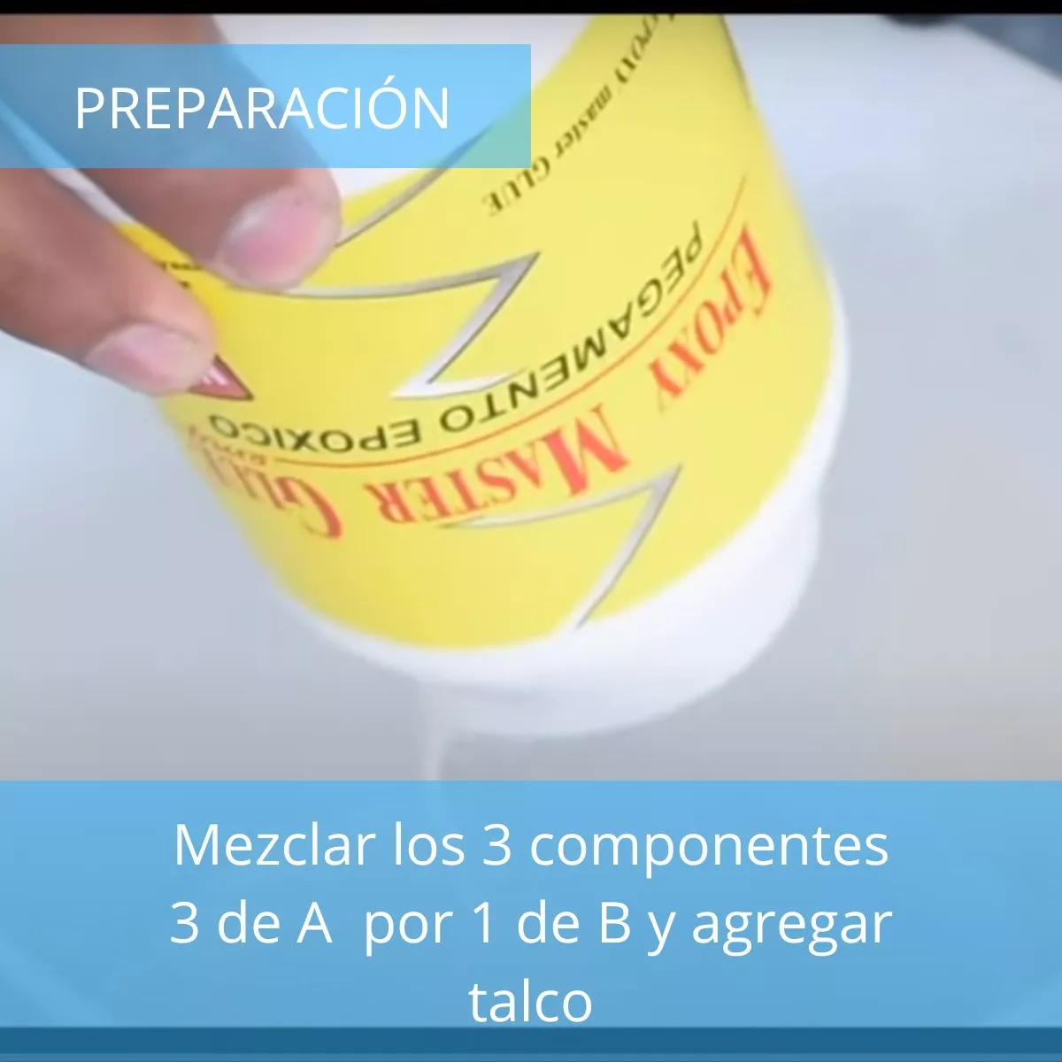 - En un recipiente limpio y seco mezclar los componentes de EPOXY MASTER GLUE durante 2 min. máximo y vaciar sobre la superficie limpia y seca.