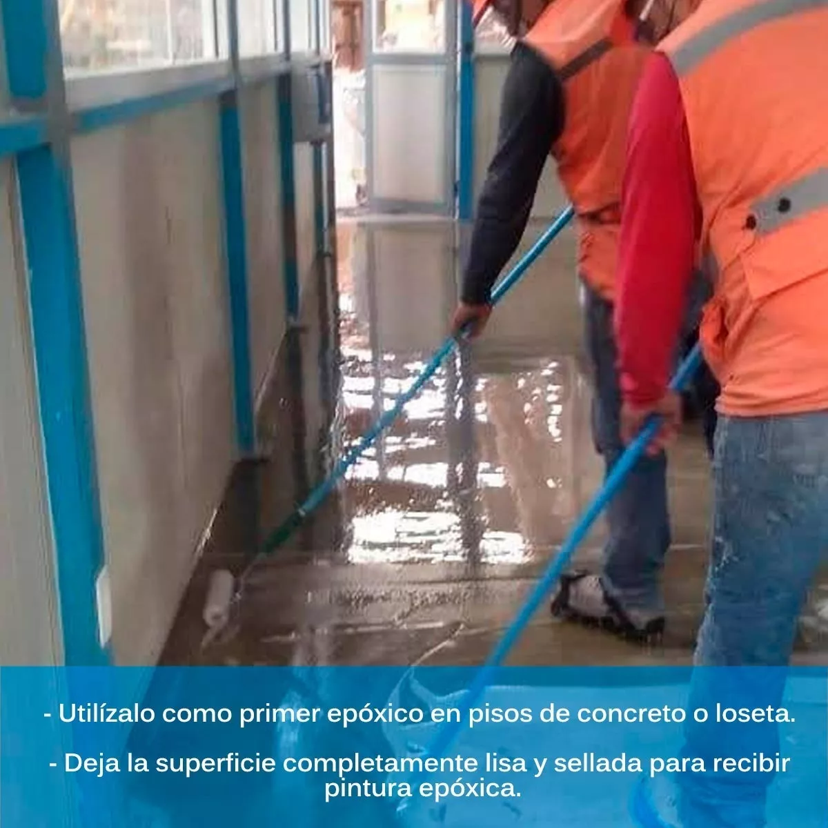 Se utiliza como primer Epóxico para sellar y alisar la superficie como pisos de concreto o pisos cerámicos . Deja una superficie completamente lisa sin juntas lista para recibir el acabado con porcelanato líquido