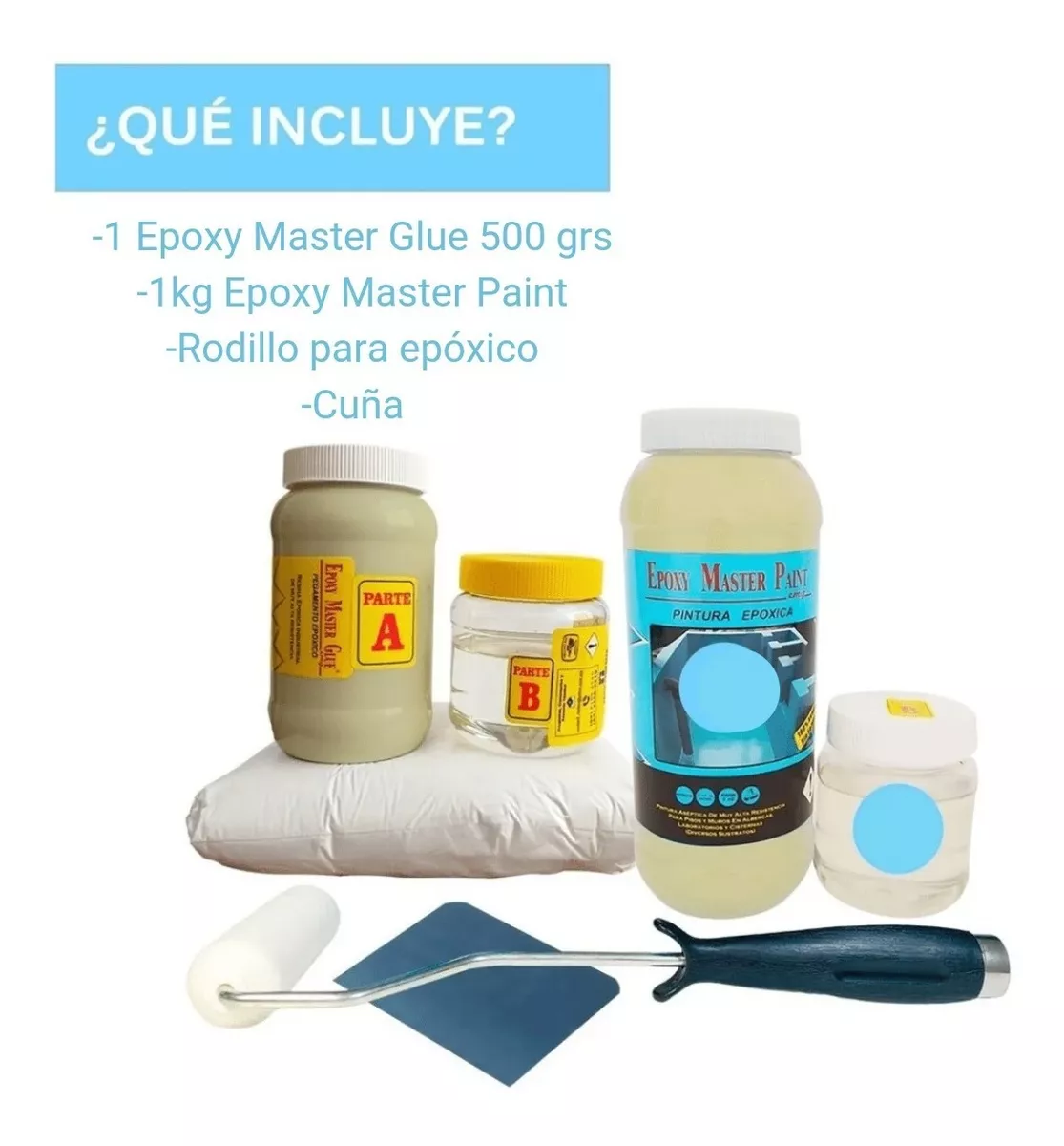 - En un recipiente limpio y seco mezclar los componentes de EPOXY MASTER GLUE (Etiqueta amarilla) y vaciar sobre la superficie limpia y seca con la cuña incluida. Dejar Secar 24 hrs.