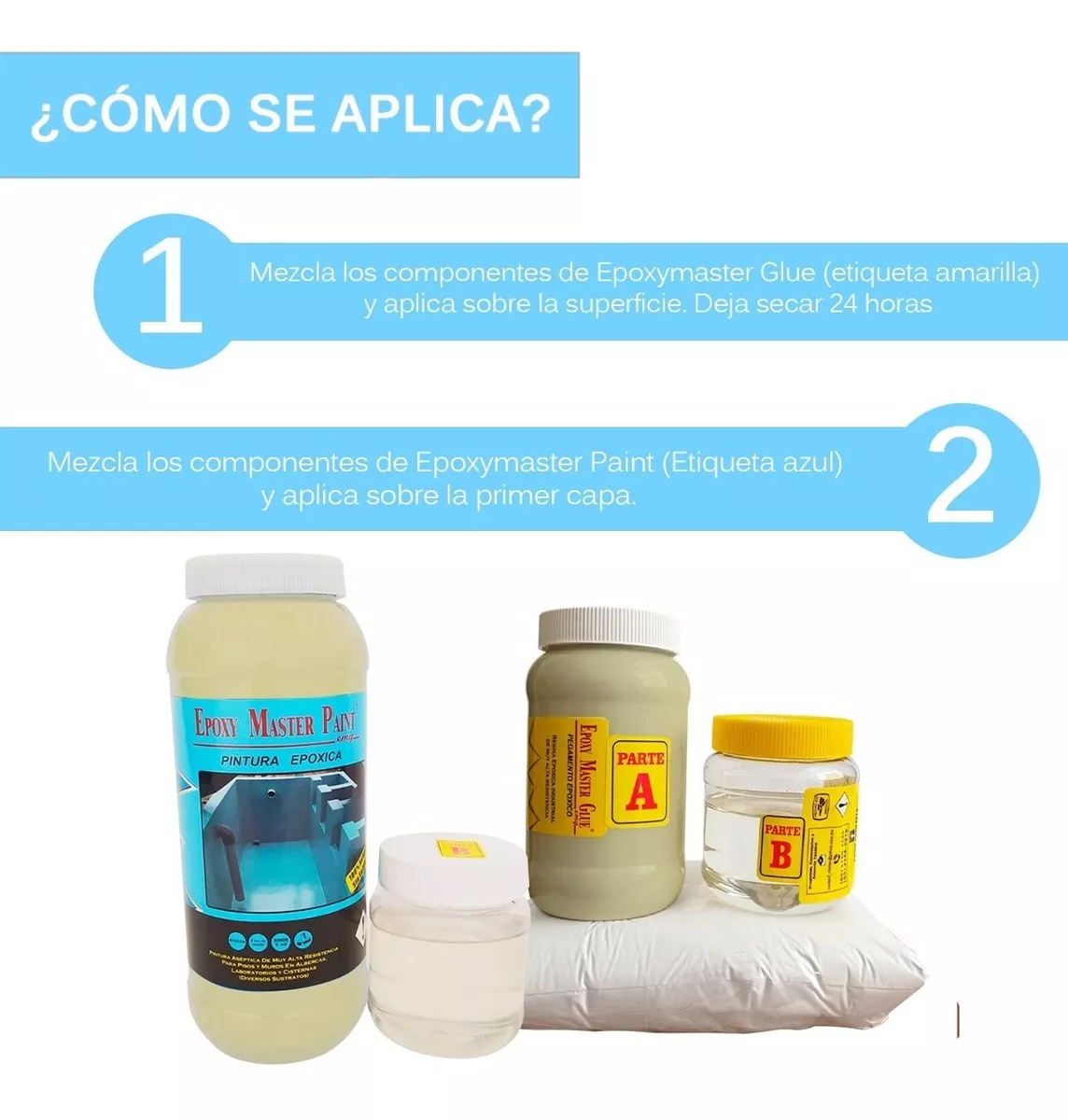 - En un recipiente limpio y seco, mezclar los componentes de EPOXY MASTER PAINT (Etiqueta azul) y aplicar sobre la primera capa utilizando el rodillo incluido. Dejar secar 24 hrs.