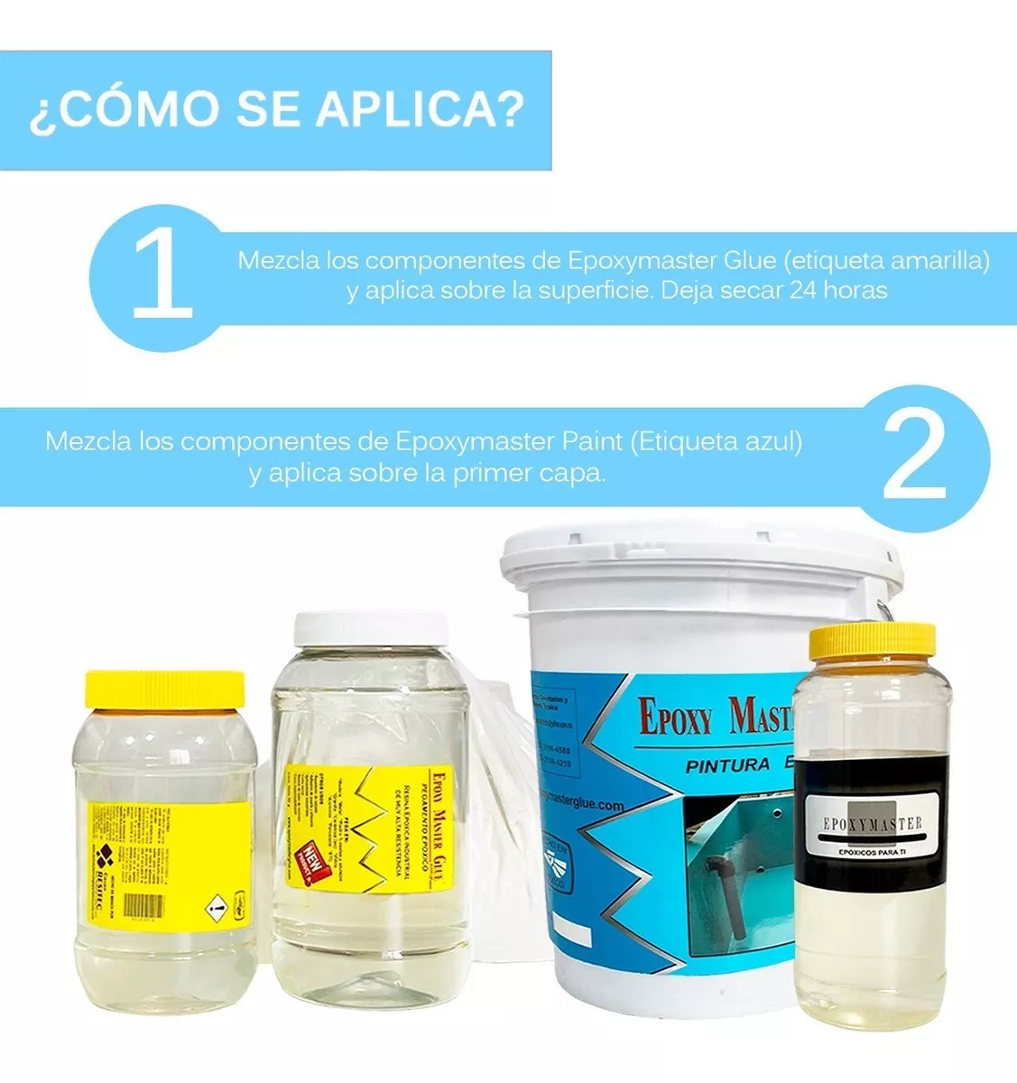 - En un recipiente limpio y seco, mezclar los componentes de EPOXY MASTER PAINT (Etiqueta azul) y aplicar sobre la primera capa utilizando el rodillo incluido. Dejar secar 24 hrs.