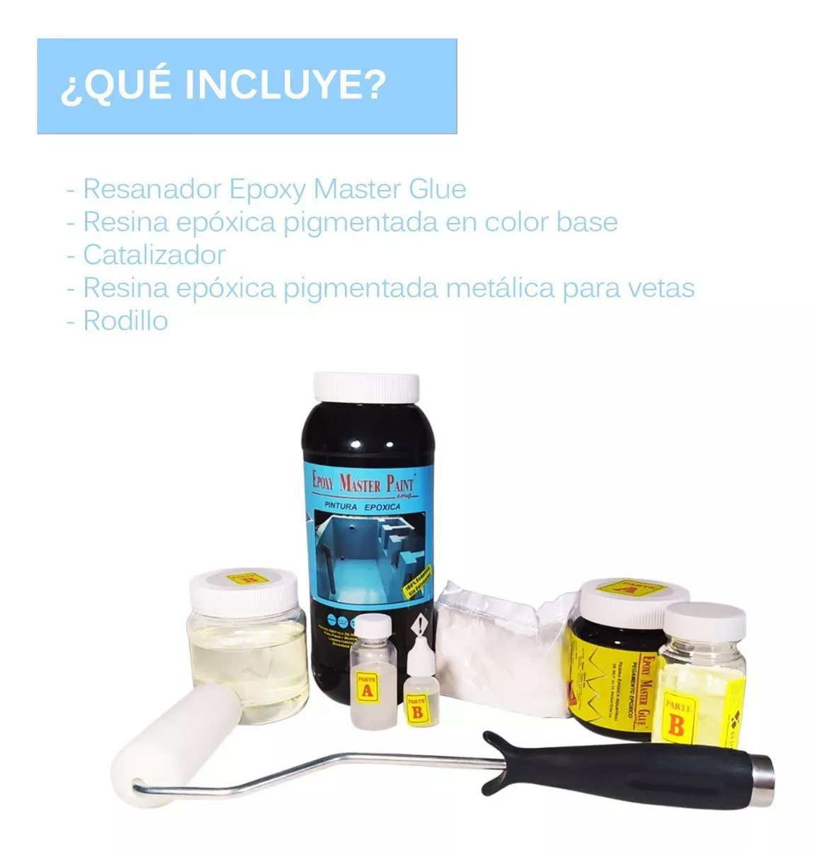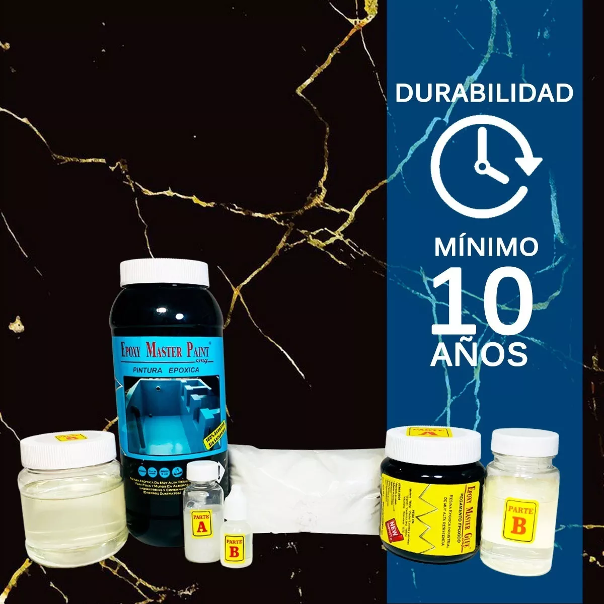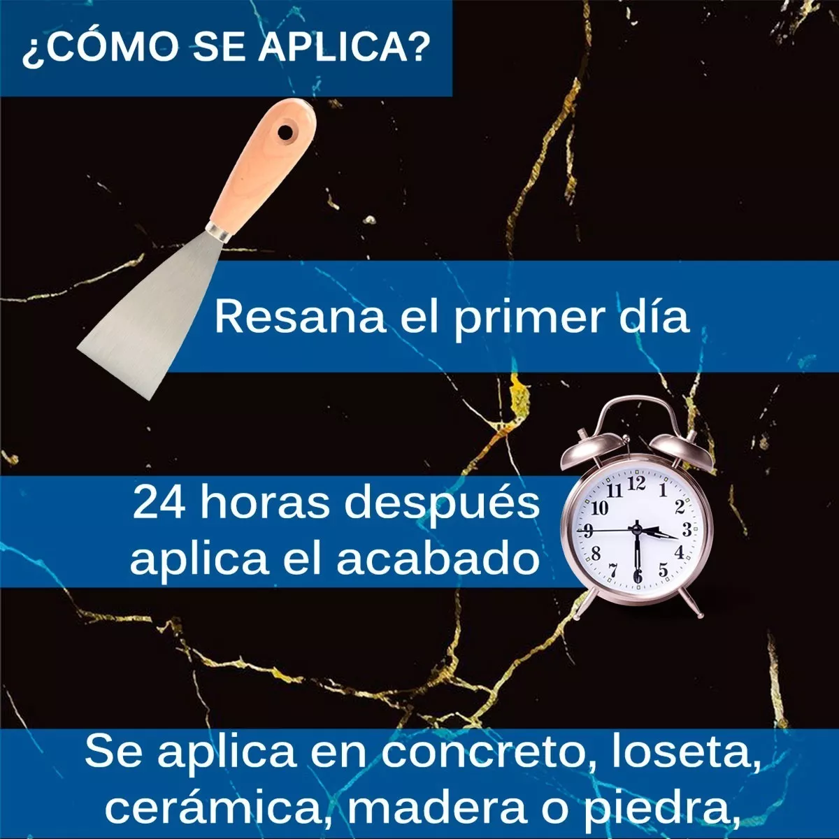 Es un kit de fácil aplicación con todo lo necesario para aplicar un recubrimiento epóxico con un acabado tipo mármol.